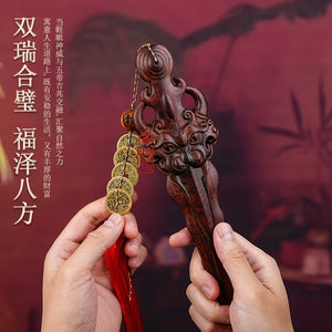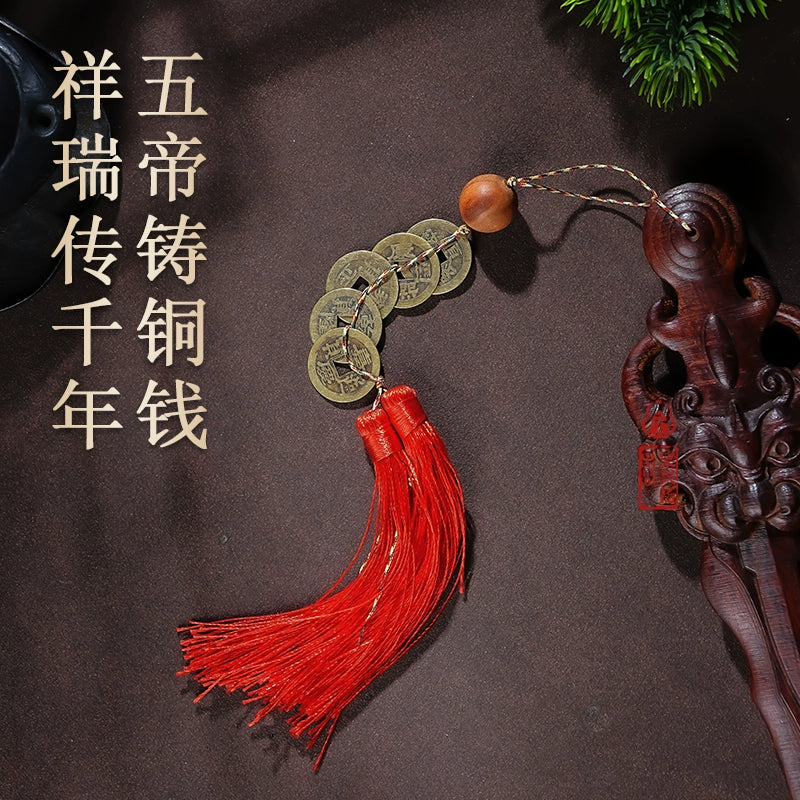 雷击桃木剑天然老料睚眦剑配五帝钱流苏摆件